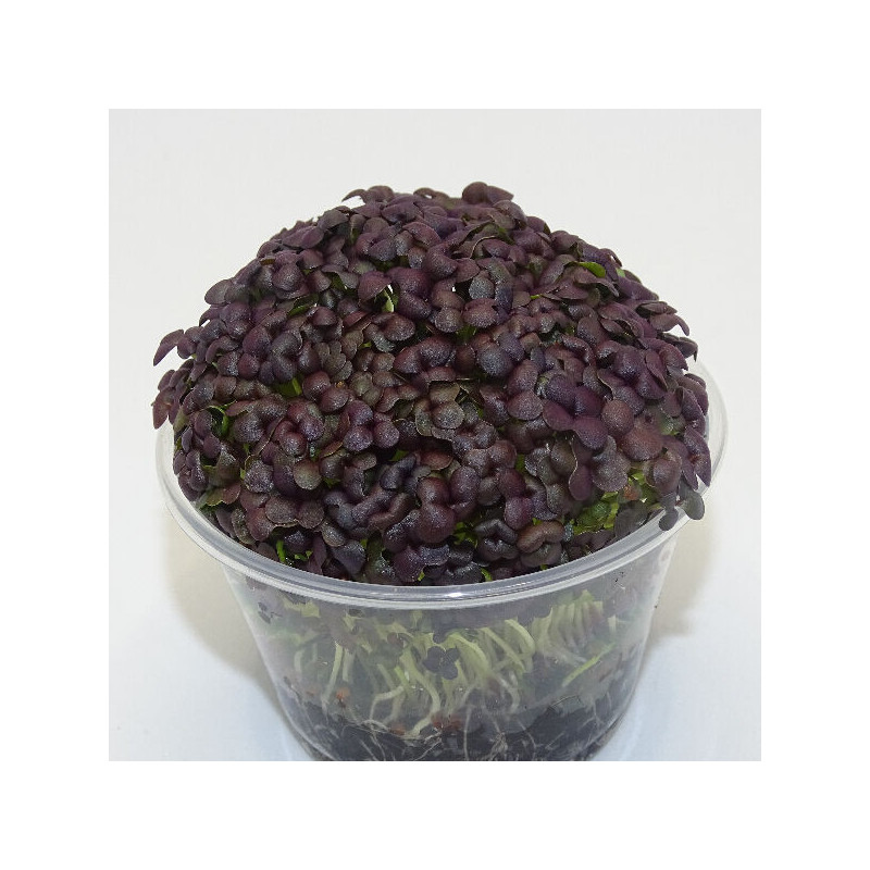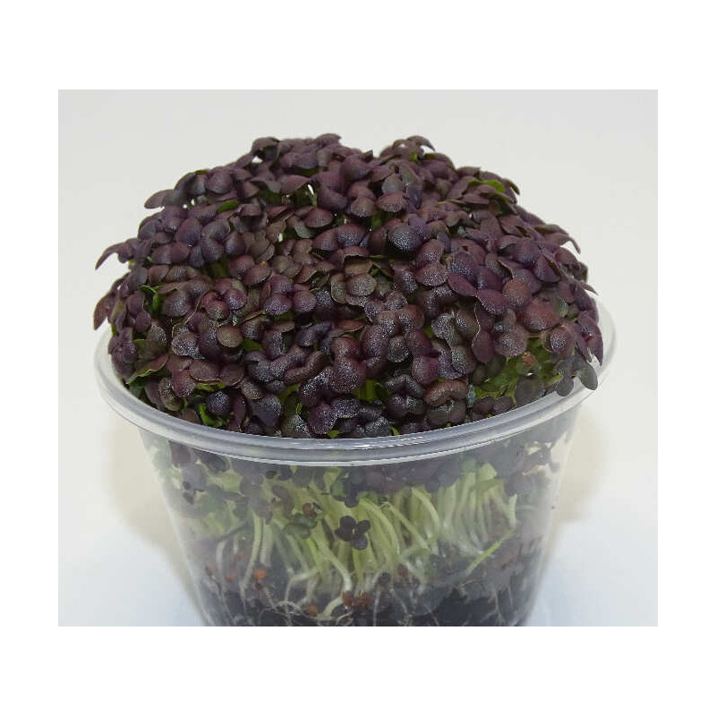Microgreens de mostaza roja en maceta viva, brotes tiernos comestibles de corte directo, con un sabor intenso y ligeramente picante que aporta carácter y personalidad a cualquier plato. Destacan por su color rojizo vibrante y su perfil aromático potente, ideales para realzar tanto el sabor como la presentación.