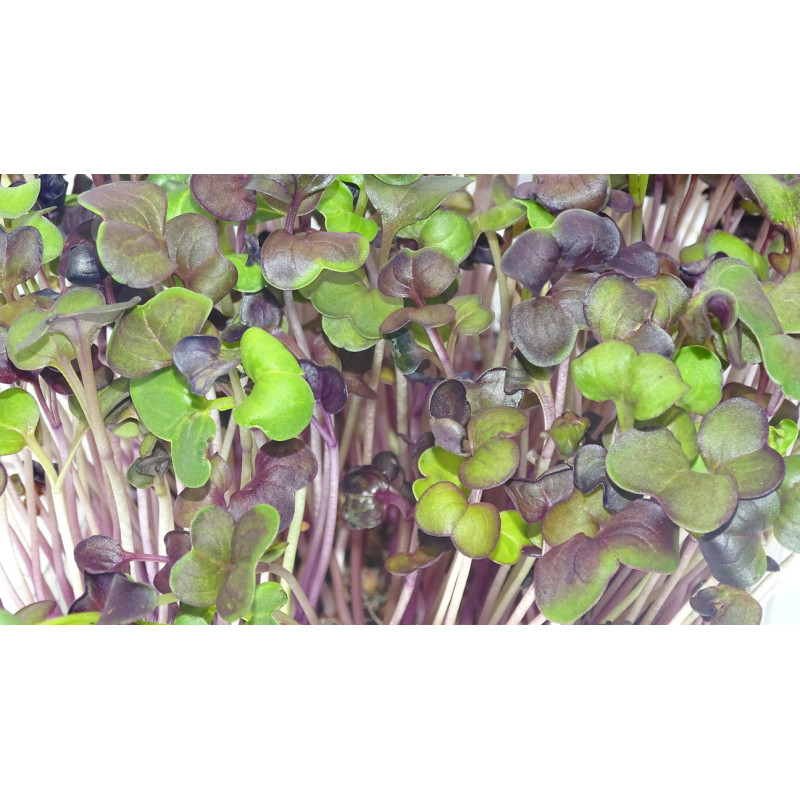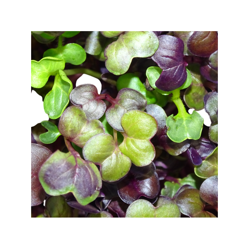 El Rábano Rojo Rambo es una variedad premium de rábano japonés, cultivada por su intenso color carmín y su perfil sensorial único: picante limpio, sin amargor, con notas frescas de rábano picante y rábano blanco. En formato microgreen (7–10 días de crecimiento), concentra hasta 5x más isotiocianatos — compuestos con propiedades antioxidantes y antiinflamatorias.
