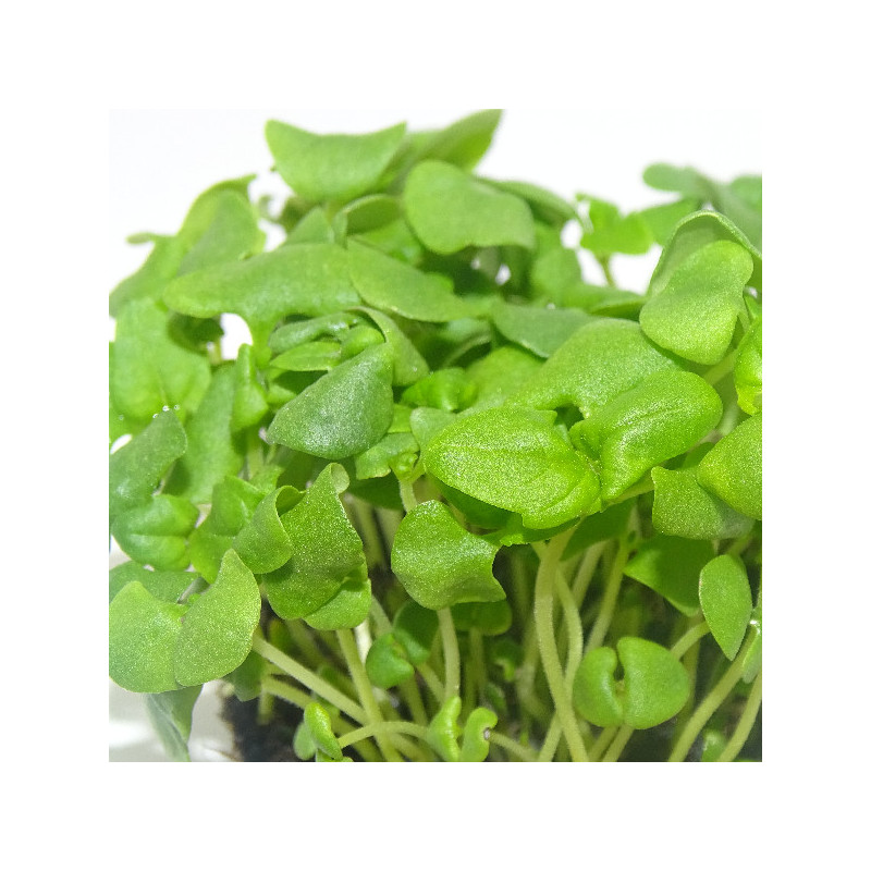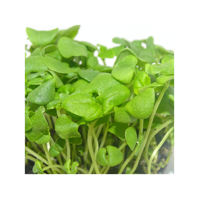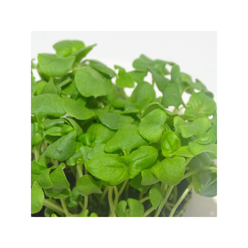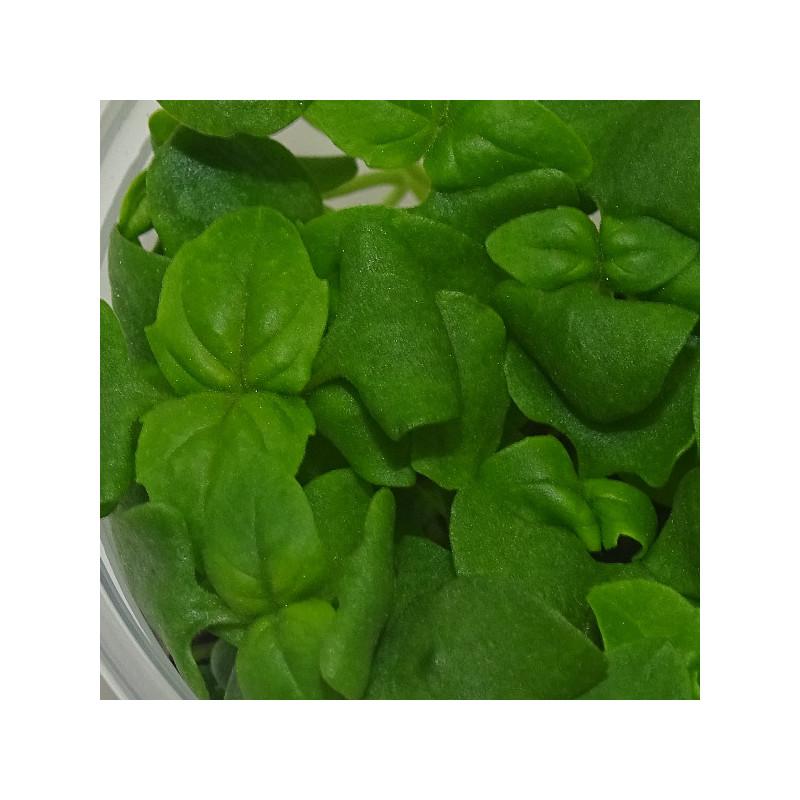 Microgreens de albahaca canela en blíster cortado, brotes tiernos comestibles listos para consumir, con un perfil aromático único que combina notas dulces, especiadas y frescas. Este microvegetal destaca por su intensidad aromática y su versatilidad, siendo ideal para postres, cócteles, ensaladas y cocina gourmet.